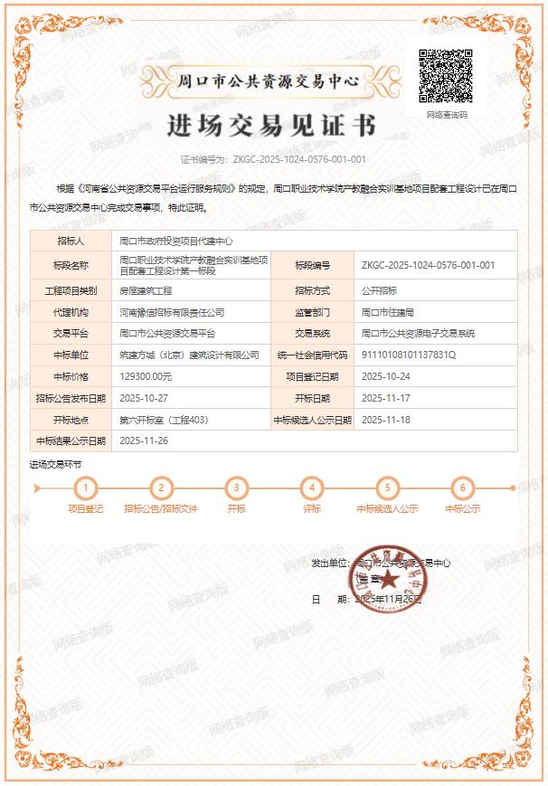 周口职业技术学院产教融合实训基地项目配套工程设计中标结果公告
